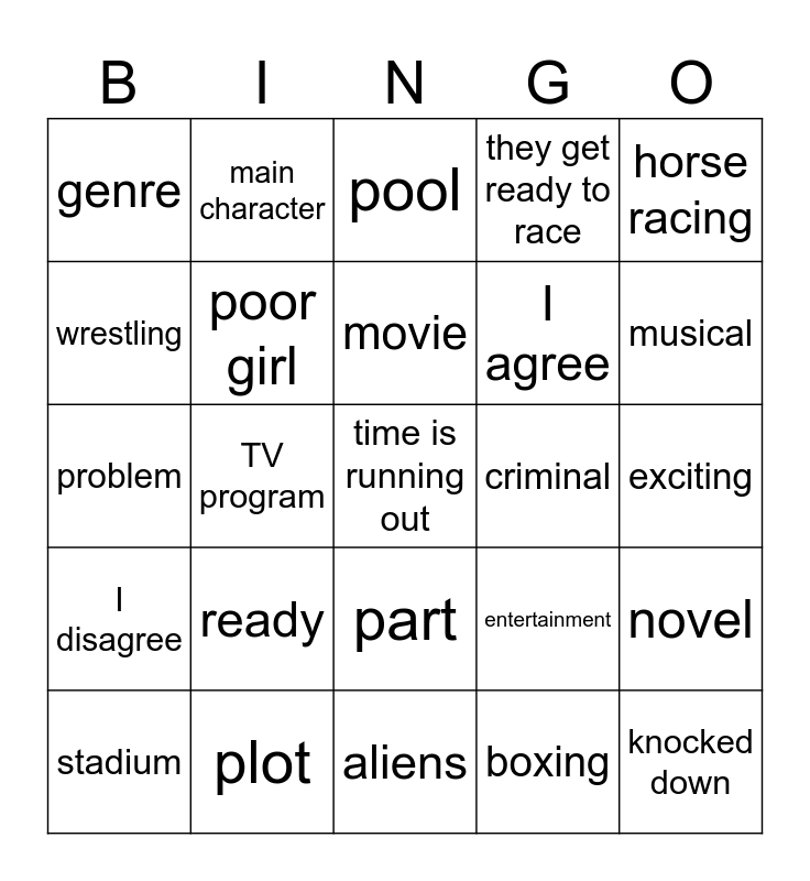 This bingo card has a free space and 24 words: ready, plot, movie, stadium, horse racing, genre, wrestling, main character, criminal, part, I agree, problem, entertainment, novel, poor girl, boxing, exciting, pool, musical, TV program, knocked down, I disagree, they get ready to race and aliens.