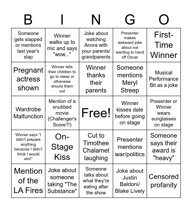 This bingo card has a free space and 39 words: Conan O’Brien sits in the audience as a bit, Winner trips or stumbles their way to the stage, Winner thanks their significant other, Winner tells their children to go to sleep or otherwise shouts them out, Mention of the LA Fires, Cut to Timothee Chalamet laughing, Winner thanks their parents, Teleprompter Issue/ Presenter complains, First-Time Winner, Winner says “I didn’t prepare anything because I didn’t think I would win!”, Mention of a snubbed movie (Challenger's Score?!), Presenter makes awkward joke about not wanting to hand off Oscar, Censored profanity, Presenter or Winner wears sunglasses on stage, Winner kisses date before going on stage, On-Stage Kiss, Someone makes a “subtle” comment about the President, Someone gets slapped or mentions last year's slap, Standing Ovation, Presenter mentions war/politics, Pregnant actress shown, Someone talks about what they're eating after the show, Someone mentions Meryl Streep, Musical Performance Bit as a joke, Someone adjusts their bowtie on screen, Memorial Montage, Winner pulls out note cards for their speech, Winner says "I've forgotten someone" in their thank yous, Music cuts off speech, Winner walks up to mic and says "wow...", Joke about "Holding Space" for Wicked, Someone does the Defying Gravity ending riff, Joke about watching Anora with your parents/ grandparents, Joke about someone taking "The Substance", Joke about Justin Baldoni/ Blake Lively, Taylor Swift joke, Someone says their award is "heavy", Wardrobe Malfunction and Severance Reference.