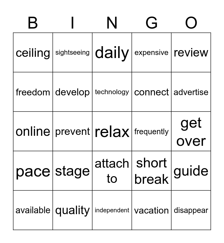 This bingo card has 28 words: guide, historic, connect, vacation, freedom, daily, sightseeing, pace, frequently, available, online, expensive, quality, independent, advertise, encourage, stage, develop, technology, attach to, ceiling, disappear, relax, prevent, get over, short break, review and support.