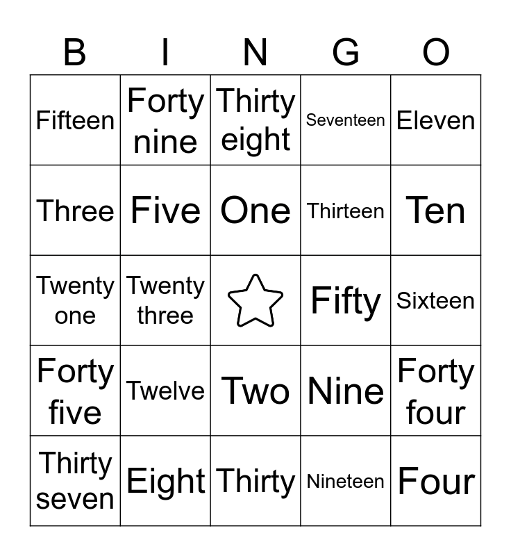 This bingo card has a free space and 24 words: Twelve, Eight, One, Thirty seven, Eleven, Fifteen, Three, Forty nine, Fifty, Two, Thirteen, Twenty one, Nine, Forty four, Five, Nineteen, Sixteen, Thirty eight, Ten, Twenty three, Four, Forty five, Seventeen and Thirty.