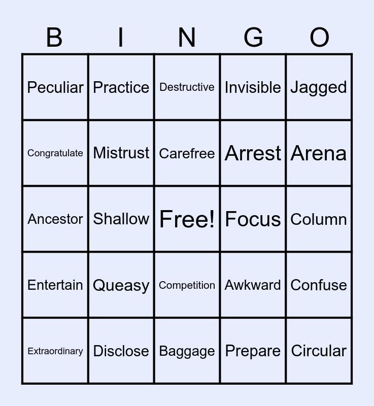 This bingo card has a free space and 25 words: Queasy, Baggage, Carefree, Extraordinary, Jagged, Peculiar, Congratulate, Practice, Focus, Competition, Arrest, Ancestor, Awkward, Confuse, Mistrust, Recognize, Column, Destructive, Arena, Shallow, Circular, Disclose, Entertain, Invisible and Prepare.