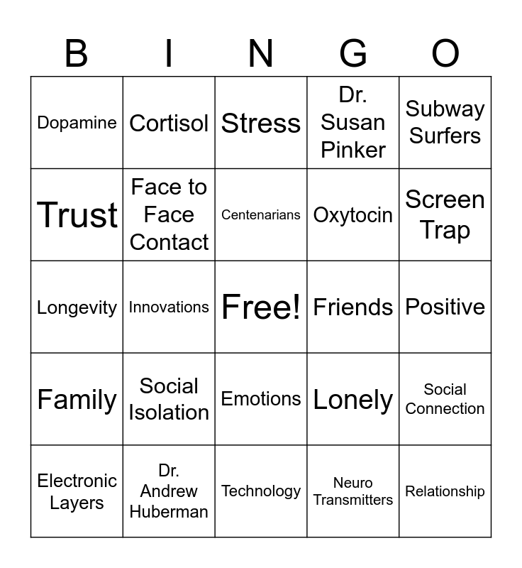 This bingo card has a free space and 28 words: Social Connection, Social Integration, Oxytocin, Neuro Transmitters, Trust, Stress, Cortisol, Family, Friends, Electronic Layers, Longevity, Dr. Susan Pinker, Dr. Andrew Huberman, Technology, Screen Trap, Texting Calling, Social Isolation, Face to Face Contact, Centenarians, Emotions, Dopamine, Empathy, Relationship, Innovations, Positive, Lonely, Subway Surfers and Engaged.