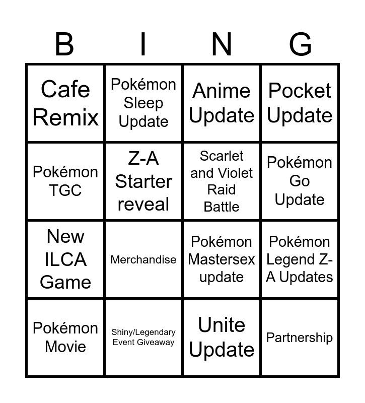 This bingo card has 16 words: Pokémon Movie, Shiny/Legendary Event Giveaway, Anime Update, Pocket Update, Pokémon TGC, Pokémon Sleep Update, Pokémon Mastersex update, Pokémon Legend Z-A Updates, Cafe Remix, Z-A Starter reveal, Unite Update, Pokémon Go Update, New ILCA Game, Merchandise, Scarlet and Violet Raid Battle and Partnership.
