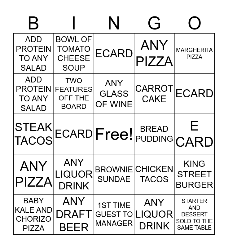 This bingo card has a free space and 24 words: ANY LIQUOR DRINK, ANY DRAFT BEER, ANY GLASS OF WINE, BABY KALE AND CHORIZO PIZZA, MARGHERITA PIZZA, ADD PROTEIN TO ANY SALAD, ADD PROTEIN TO ANY SALAD, BOWL OF TOMATO CHEESE SOUP, BREAD PUDDING, BROWNIE SUNDAE, CARROT CAKE, STEAK TACOS, CHICKEN TACOS, KING STREET BURGER, TWO FEATURES OFF THE BOARD, ANY LIQUOR DRINK, E CARD, ECARD, ECARD, ECARD, STARTER AND DESSERT SOLD TO THE SAME TABLE, ANY PIZZA, ANY PIZZA and 1ST TIME GUEST TO MANAGER.