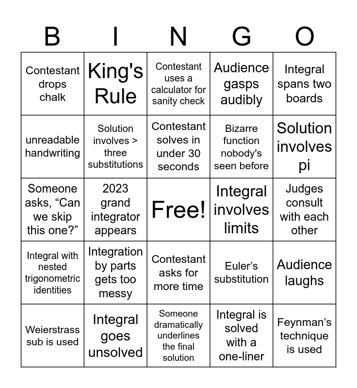 This bingo card has a free space and 24 words: Integration by parts gets too messy, Integral goes unsolved, Contestant solves in under 30 seconds, Weierstrass sub is used, Integral spans two boards, Contestant drops chalk, unreadable handwriting, King's Rule, Integral involves limits, Contestant asks for more time, Bizarre function nobody's seen before, Someone asks, “Can we skip this one?”, Euler’s substitution, Audience laughs, Solution involves > three substitutions, Integral is solved with a one-liner, Judges consult with each other, Contestant uses a calculator for sanity check, Solution involves pi, 2023 grand integrator appears, Feynman’s technique is used, Integral with nested trigonometric identities, Audience gasps audibly and Someone dramatically underlines the final solution.