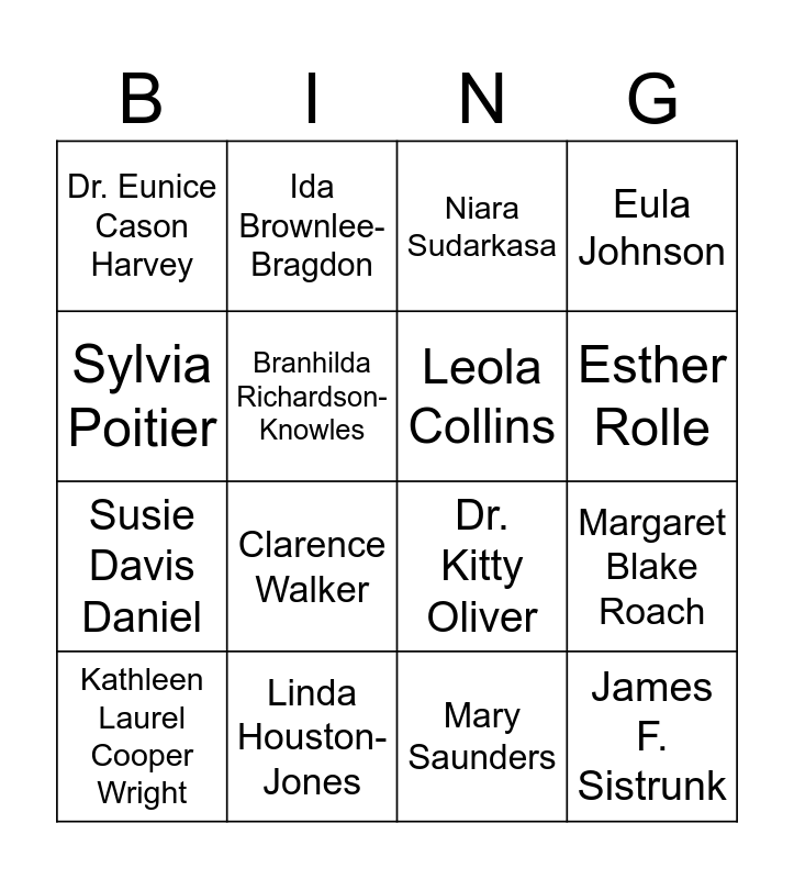 This bingo card has 25 words: Free!, Blanche Ely, Esther Rolle, Hazel Armbrister, Sylvia Poitier, Dr. Eunice Cason Harvey, Branhilda Richardson-Knowles, Ida Brownlee-Bragdon, Linda Houston-Jones, Joseph Algernon Ely, Susie Davis Daniel, Dr. Kitty Oliver, Henry Graham, O.B. Johnson, Leola Collins, Isadore & Minnie Mizell, Mary Saunders, Niara Sudarkasa, Clarence Walker, Margaret Blake Roach, Kathleen Laurel Cooper Wright, Von Delaney Mizell, James F. Sistrunk, Eula Johnson and Julian "Cannonball" Adderley.