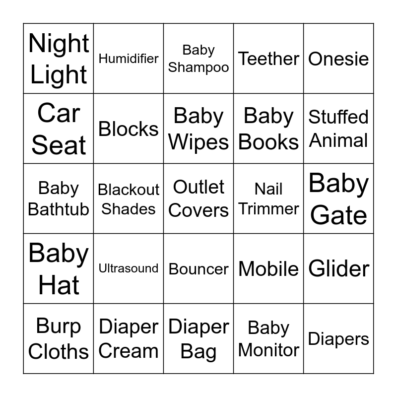 This bingo card has 50 words: Wash Cloths, Outlet Covers, High Chair, Diaper Bag, Ultrasound, Diaper Caddy, Humidifier, Hooded Towel, Car Seat, Bottle, Blocks, Teether, Glider, Mobile, Activity Mat, Pack N Play Play Yard, Baby Wipes, Nail Trimmer, Changing Pad/Table, Onesie, Blackout Shades, Baby Monitor, Night Light, Baby Books, Swaddle, Diapers, Stuffed Animal, Baby Cough Syrup, Baby Shampoo, Bouncer, Baby Safe Detergent, Bassinet, Stroller, Thermometer, Diaper Cream, Carrier, Crib, Pacifier, Bottle Warmer, Baby Gate, Milk, Swing, Formula, Bib, Burp Cloths, Baby Bathtub, Diaper Cream Spatula, Hamper, Baby Hat and Diaper Pail.