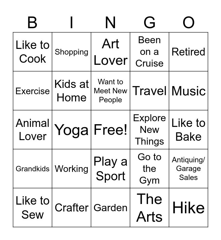 This bingo card has a free space and 29 words: Like to Sew, Love the Outdoors, Yoga, Love to Read, Like to Cook, Art Lover, Kids at Home, Working, Explore New Things, Crafter, Like to Bake, Hike, Garden, The Arts, Music, Wine Tasting, Play a Sport, Grandkids, Retired, Animal Lover, Go to the Gym, Can Play an Instrument, Travel, Exercise, Been on a Cruise, Shopping, Antiquing/ Garage Sales, Want to Meet New People and Been out of the Country.