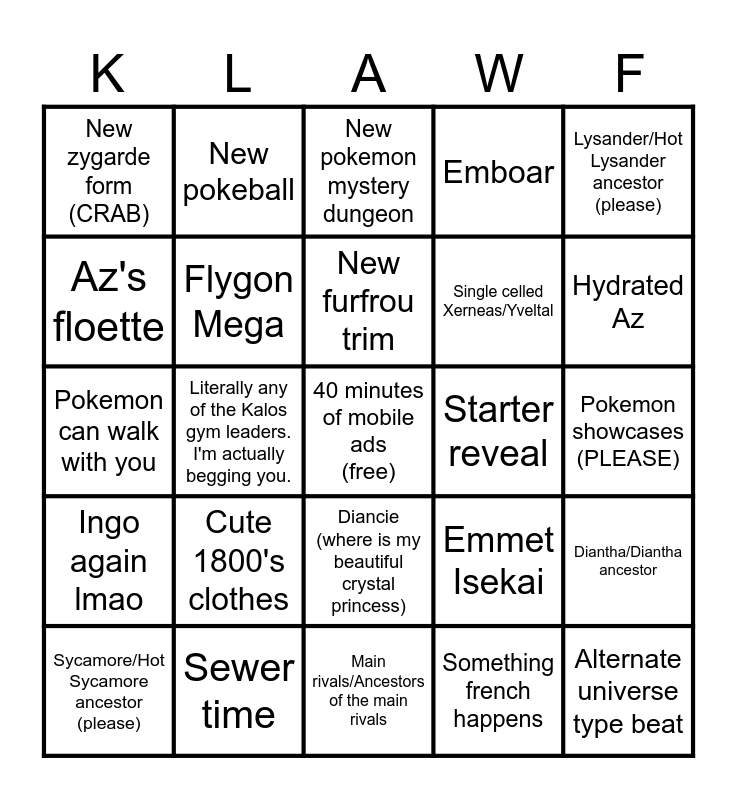 This bingo card has a free space and 24 words: Cute 1800's clothes, Sewer time, New furfrou trim, Sycamore/Hot Sycamore ancestor (please), Lysander/Hot Lysander ancestor (please), New zygarde form (CRAB), Az's floette, New pokeball, Starter reveal, Diancie (where is my beautiful crystal princess), Single celled Xerneas/Yveltal, Pokemon can walk with you, Emmet Isekai, Diantha/Diantha ancestor, Flygon Mega, Something french happens, Pokemon showcases (PLEASE), New pokemon mystery dungeon, Hydrated Az, Literally any of the Kalos gym leaders. I'm actually begging you., Alternate universe type beat, Ingo again lmao, Emboar and Main rivals/Ancestors of the main rivals.