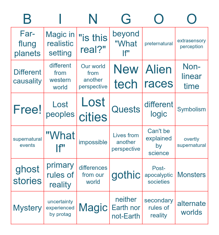 This bingo card has 36 words: gothic, differences from our world, neither Earth nor not-Earth, Different causality, supernatural events, Quests, different from western world, Magic, preternatural, Post-apocalyptic societies, Non-linear time, beyond "What If", Monsters, Lost peoples, New tech, Far-flung planets, ghost stories, different logic, Free!, "is this real?", Lost cities, "What If", Lives from another perspective, impossible, Can't be explained by science, Magic in realistic setting, Alien races, uncertainty experienced by protag, Our world from another perspective, extrasensory perception, alternate worlds, Mystery, overtly supernatural, Symbolism, primary rules of reality and secondary rules of reality.