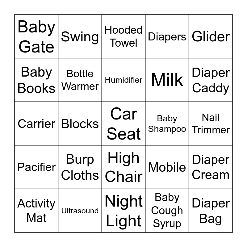 This bingo card has 50 words: Baby Safe Detergent, Car Seat, Stroller, Night Light, Burp Cloths, Baby Wipes, Swing, Swaddle, Baby Books, Hamper, Bottle Warmer, Diapers, Diaper Cream, Mobile, Outlet Covers, Bassinet, Humidifier, Baby Shampoo, Diaper Pail, Glider, Blocks, Baby Cough Syrup, Baby Gate, Milk, Bouncer, Diaper Bag, Diaper Caddy, Baby Hat, Hooded Towel, High Chair, Diaper Cream Spatula, Wash Cloths, Baby Bathtub, Crib, Ultrasound, Teether, Baby Monitor, Onesie, Pack N Play Play Yard, Nail Trimmer, Stuffed Animal, Formula, Thermometer, Blackout Shades, Activity Mat, Carrier, Bib, Bottle, Pacifier and Changing Pad/Table.