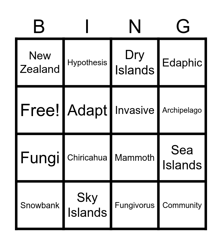 This bingo card has 16 words: Sky Islands, Sea Islands, Dry Islands, New Zealand, Fungi, Hypothesis, Mammoth, Fungivorus, Free!, Adapt, Snowbank, Edaphic, Chiricahua, Archipelago, Invasive and Community.
