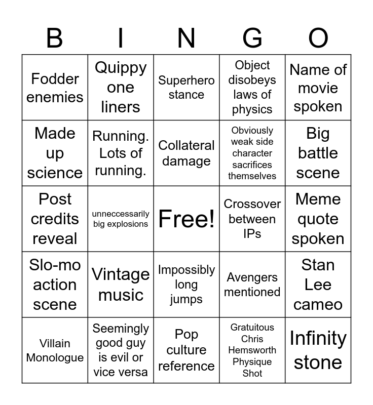 This bingo card has a free space and 24 words: Vintage music, Seemingly good guy is evil or vice versa, Collateral damage, Villain Monologue, Name of movie spoken, Fodder enemies, Made up science, Quippy one liners, Crossover between IPs, Impossibly long jumps, Obviously weak side character sacrifices themselves, Post credits reveal, Avengers mentioned, Stan Lee cameo, Running. Lots of running., Gratuitous Chris Hemsworth Physique Shot, Meme quote spoken, Superhero stance, Big battle scene, unneccessarily big explosions, Infinity stone, Slo-mo action scene, Object disobeys laws of physics and Pop culture reference.