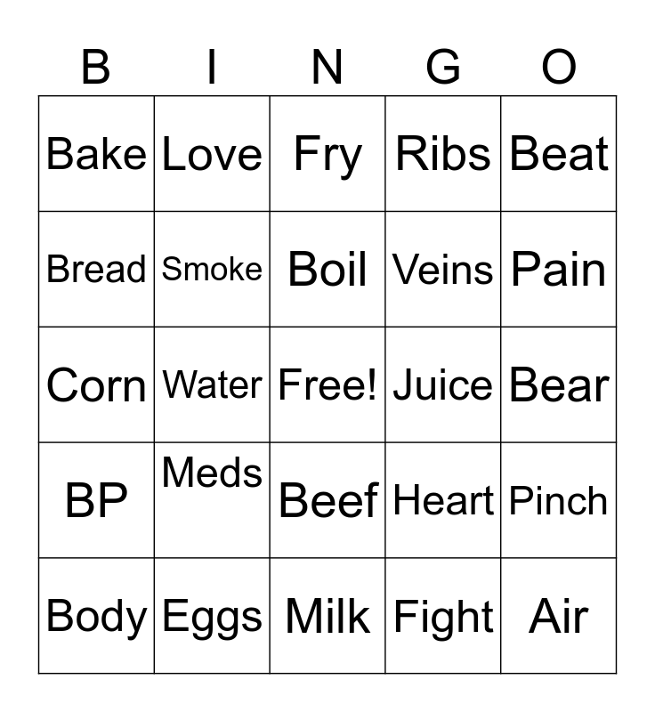 This bingo card has a free space and 24 words: Body, Meds, Boil, Fight, Beat, Bake, Love, Fry, Juice, Bear, Corn, Smoke, Heart, Pinch, Bread, Eggs, Milk, Ribs, Pain, BP, Water, Beef, Veins and Air.