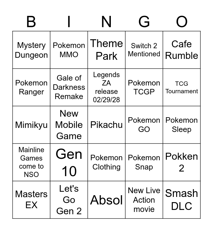 This bingo card has a free space and 24 words: Gen 10, Let's Go Gen 2, Legends ZA release 02/29/28, Masters EX, Cafe Rumble, Mystery Dungeon, Pokemon Ranger, Pokemon MMO, Pokemon GO, Pokemon Clothing, Pokemon TCGP, Mimikyu, Pokemon Snap, Pokken 2, Gale of Darkness Remake, New Live Action movie, Pokemon Sleep, Theme Park, TCG Tournament, New Mobile Game, Smash DLC, Mainline Games come to NSO, Switch 2 Mentioned and Absol.
