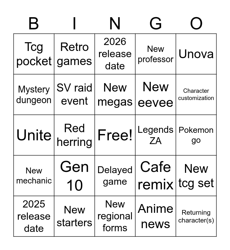 This bingo card has a free space and 24 words: Gen 10, New starters, New megas, 2025 release date, Unova, Tcg pocket, Mystery dungeon, Retro games, Legends ZA, Delayed game, New eevee, Unite, Cafe remix, New tcg set, SV raid event, Anime news, Pokemon go, 2026 release date, Character customization, Red herring, Returning character(s), New mechanic, New professor and New regional forms.