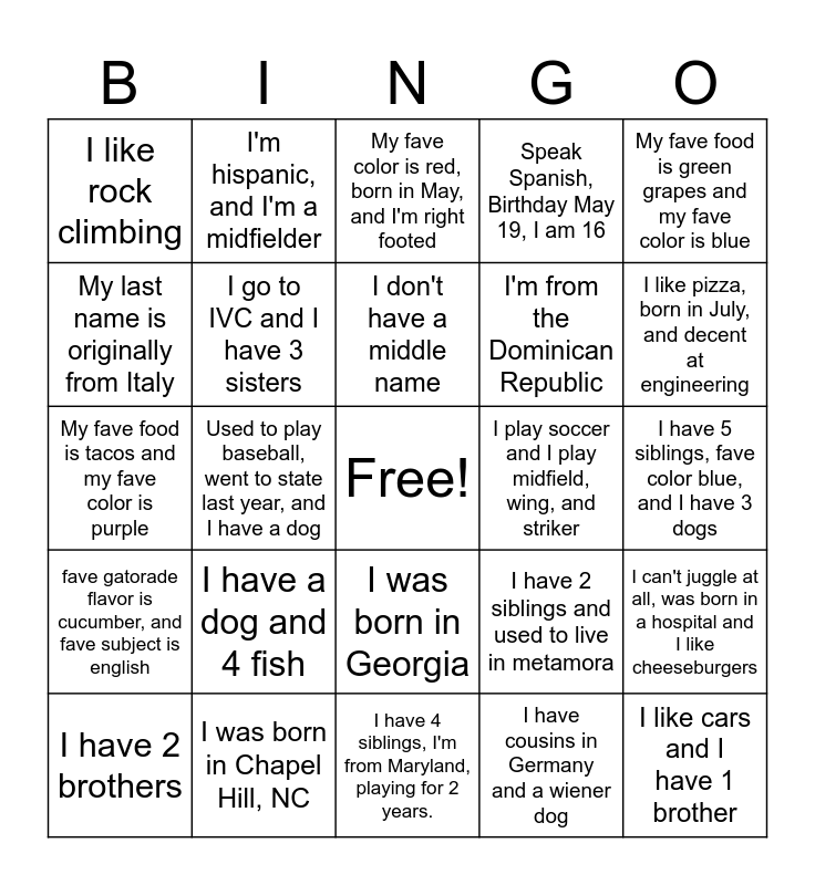 This bingo card has a free space and 24 words: I have a dog and 4 fish, I was born in Chapel Hill, NC, I don't have a middle name, I have 2 brothers, My fave food is green grapes and my fave color is blue, I like rock climbing, My last name is originally from Italy, I'm hispanic, and I'm a midfielder, I play soccer and I play midfield, wing, and striker, I was born in Georgia, I'm from the Dominican Republic, My fave food is tacos and my fave color is purple, I have 2 siblings and used to live in metamora, I can't juggle at all, was born in a hospital and I like cheeseburgers, I go to IVC and I have 3 sisters, I have cousins in Germany and a wiener dog, I have 5 siblings, fave color blue, and I have 3 dogs, My fave color is red, born in May, and I'm right footed, I like pizza, born in July, and decent at engineering, Used to play baseball, went to state last year, and I have a dog, I like cars and I have 1 brother, fave gatorade flavor is cucumber, and fave subject is english, Speak Spanish, Birthday May 19, I am 16 and I have 4 siblings, I'm from Maryland, playing for 2 years..
