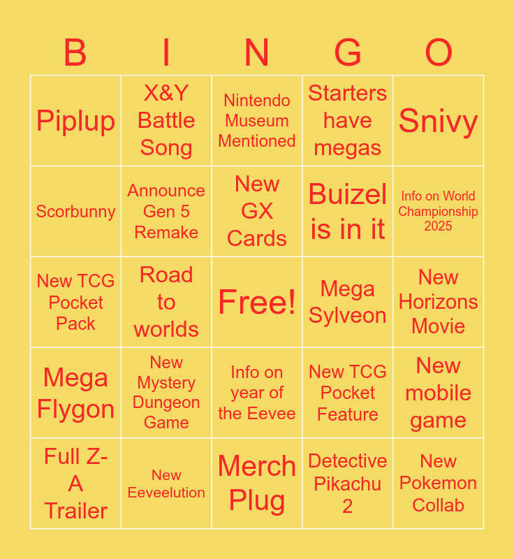 This bingo card has a free space and 24 words: New Mystery Dungeon Game, New Eeveelution, New GX Cards, Full Z-A Trailer, Snivy, Piplup, Scorbunny, X&Y Battle Song, Mega Sylveon, Info on year of the Eevee, Buizel is in it, New TCG Pocket Pack, New TCG Pocket Feature, New mobile game, Announce Gen 5 Remake, Detective Pikachu 2, New Horizons Movie, Nintendo Museum Mentioned, Info on World Championship 2025, Road to worlds, New Pokemon Collab, Mega Flygon, Starters have megas and Merch Plug.