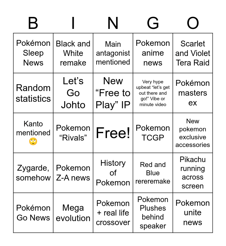 This bingo card has a free space and 24 words: Pokemon Z-A news, Mega evolution, New “Free to Play” IP, Pokémon Go News, Scarlet and Violet Tera Raid, Pokémon Sleep News, Random statistics, Black and White remake, Pokemon TCGP, History of Pokemon, Very hype upbeat “let’s get out there and go!” Vibe or minute video, Kanto mentioned 🙄, Red and Blue rereremake, Pikachu running across screen, Let’s Go Johto, Pokemon Plushes behind speaker, New pokemon exclusive accessories, Main antagonist mentioned, Pokémon masters ex, Pokemon “Rivals”, Pokemon unite news, Zygarde, somehow, Pokemon anime news and Pokemon + real life crossover.