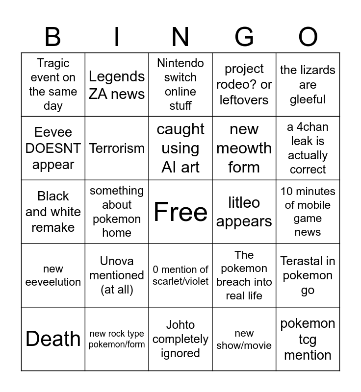 This bingo card has a free space and 24 words: Unova mentioned (at all), new rock type pokemon/form, caught using AI art, Death, the lizards are gleeful, Tragic event on the same day, Eevee DOESNT appear, Legends ZA news, litleo appears, 0 mention of scarlet/violet, new meowth form, Black and white remake, The pokemon breach into real life, Terastal in pokemon go, Terrorism, new show/movie, 10 minutes of mobile game news, Nintendo switch online stuff, a 4chan leak is actually correct, something about pokemon home, pokemon tcg mention, new eeveelution, project rodeo? or leftovers and Johto completely ignored.