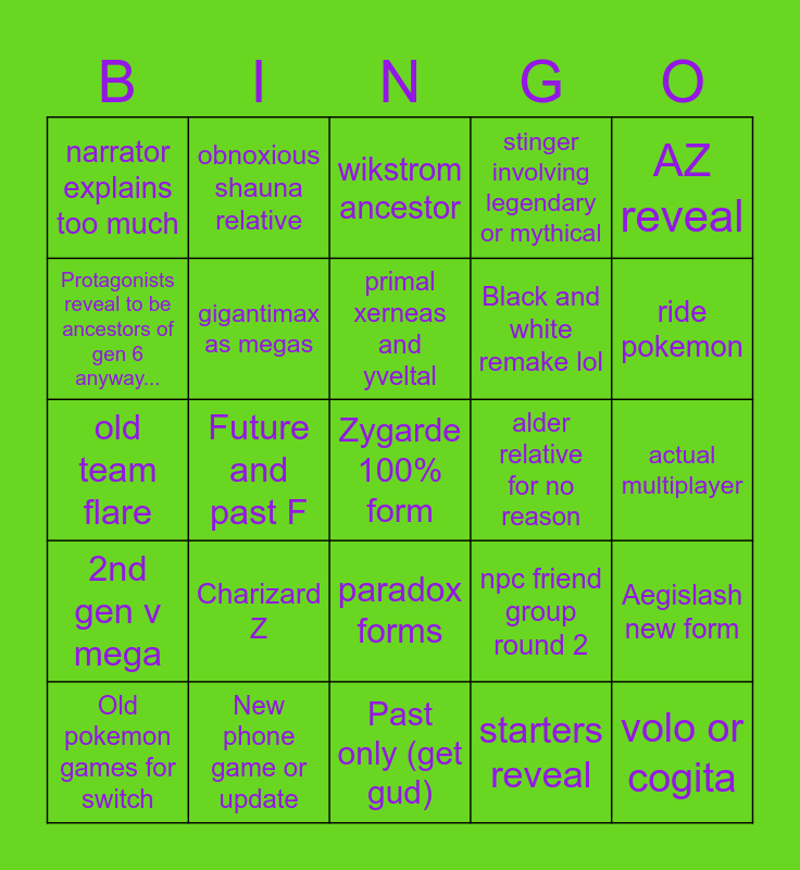 This bingo card has a free space and 24 words: Charizard Z, New phone game or update, primal xerneas and yveltal, Old pokemon games for switch, AZ reveal, narrator explains too much, Protagonists reveal to be ancestors of gen 6 anyway..., obnoxious shauna relative, alder relative for no reason, paradox forms, Black and white remake lol, old team flare, npc friend group round 2, Aegislash new form, gigantimax as megas, starters reveal, actual multiplayer, wikstrom ancestor, ride pokemon, Future and past F, volo or cogita, 2nd gen v mega, stinger involving legendary or mythical and Past only (get gud).