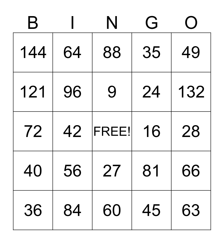 This bingo card has a free space and 24 words: 56, 84, 9, 36, 49, 144, 121, 64, 16, 27, 24, 72, 81, 66, 96, 45, 28, 88, 132, 42, 63, 40, 35 and 60.