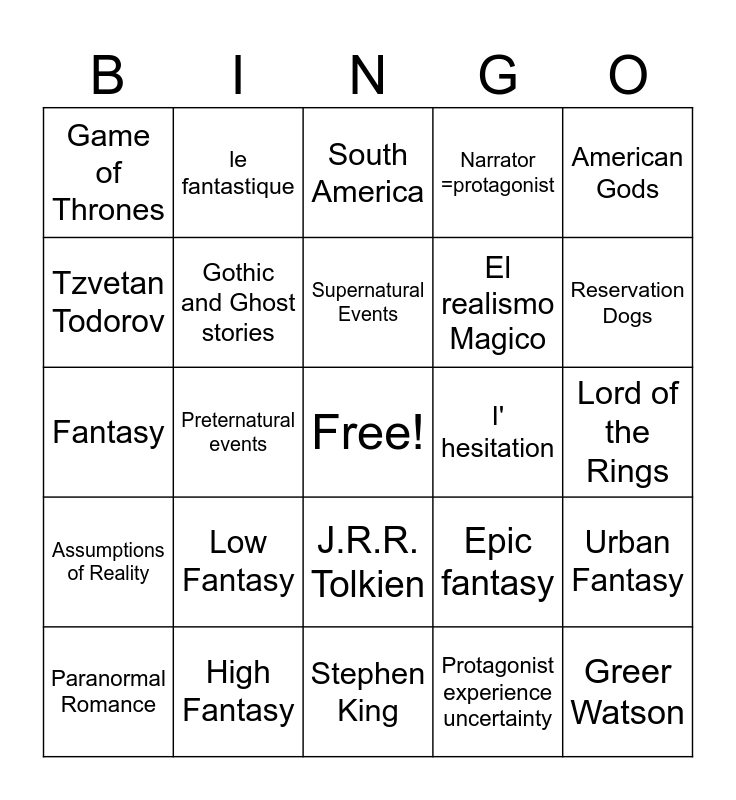 This bingo card has a free space and 24 words: Low Fantasy, High Fantasy, Supernatural Events, Paranormal Romance, American Gods, Game of Thrones, Tzvetan Todorov, le fantastique, I' hesitation, J.R.R. Tolkien, El realismo Magico, Fantasy, Epic fantasy, Urban Fantasy, Gothic and Ghost stories, Protagonist experience uncertainty, Lord of the Rings, South America, Reservation Dogs, Preternatural events, Greer Watson, Assumptions of Reality, Narrator =protagonist and Stephen King.