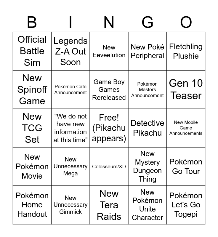 This bingo card has a free space and 24 words: New Unnecessary Mega, New Unnecessary Gimmick, Game Boy Games Rereleased, Pokémon Home Handout, Fletchling Plushie, Official Battle Sim, New Spinoff Game, Legends Z-A Out Soon, Detective Pikachu, Colosseum/XD, Pokémon Masters Announcement, New TCG Set, New Mystery Dungeon Thing, Pokémon Go Tour, Pokémon Café Announcement, New Pokémon Unite Character, New Mobile Game Announcements, New Eeveelution, Gen 10 Teaser, "We do not have new information at this time", Pokémon Let's Go Togepi, New Pokémon Movie, New Poké Peripheral and New Tera Raids.