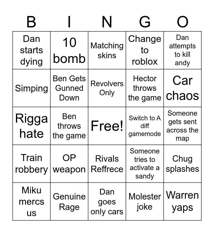 This bingo card has a free space and 24 words: Miku mercs us, OP weapon, Revolvers Only, Molester joke, Dan attempts to kill andy, Dan starts dying, 10 bomb, Matching skins, Switch to A diff gamemode, Someone gets sent across the map, Rigga hate, Ben Gets Gunned Down, Someone tries to activate a sandy, Chug splashes, Simping, Genuine Rage, Dan goes only cars, Change to roblox, Car chaos, Train robbery, Ben throws the game, Rivals Reffrece, Hector throws the game and Warren yaps.