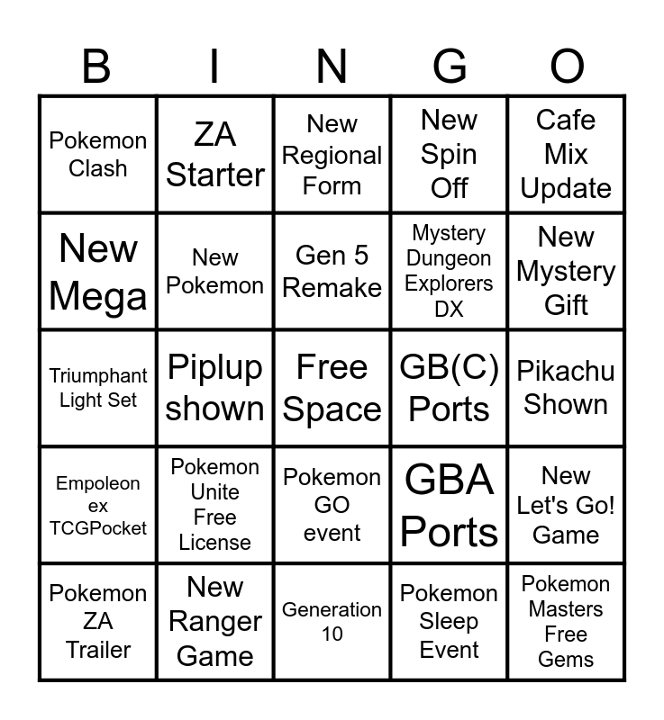 This bingo card has a free space and 24 words: Pokemon ZA Trailer, Pokemon Unite Free License, Gen 5 Remake, Pokemon Sleep Event, Cafe Mix Update, Pokemon Clash, ZA Starter, New Regional Form, GB(C) Ports, Pikachu Shown, Triumphant Light Set, New Pokemon, GBA Ports, New Let's Go! Game, New Mega, New Ranger Game, Generation 10, New Spin Off, New Mystery Gift, Empoleon ex TCGPocket, Piplup shown, Pokemon GO event, Mystery Dungeon Explorers DX and Pokemon Masters Free Gems.