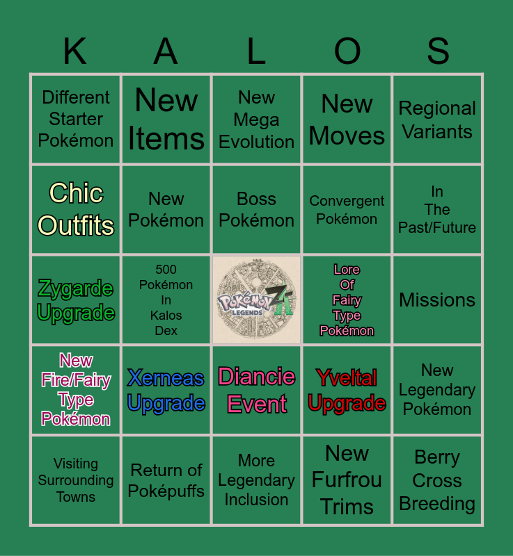 This bingo card has a free space and 24 words: Xerneas Upgrade, Return of Poképuffs, Boss Pokémon, Visiting Surrounding Towns, Regional Variants, Different Starter Pokémon, Chic Outfits, New Items, Lore Of Fairy Type Pokémon, Diancie Event, Convergent Pokémon, Zygarde Upgrade, Yveltal Upgrade, New Legendary Pokémon, New Pokémon, New Furfrou Trims, Missions, New Mega Evolution, In The Past/Future, 500 Pokémon In Kalos Dex, Berry Cross Breeding, New Fire/Fairy Type Pokémon, New Moves and More Legendary Inclusion.