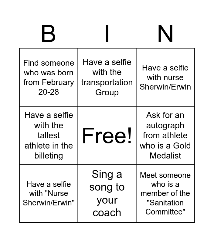 This bingo card has a free space and 12 words: Meet someone who joined Palarong Pambansa 2024, Meet an athlete whose name starts with letter "Z", Meet someone who is a member of the "Sanitation Committee", Ask for an autograph from athlete who is a Gold Medalist, Have a selfie with the transportation Group, Have a selfie with nurse Sherwin/Erwin, Sing a song to your coach, Find someone who has a "Jhule" in his name, Find someone who was born from February 20-28, Have a selfie with the tallest athlete in the billeting, Have a selfie with "Nurse Sherwin/Erwin" and Find the youngest athlete in the billeting area.