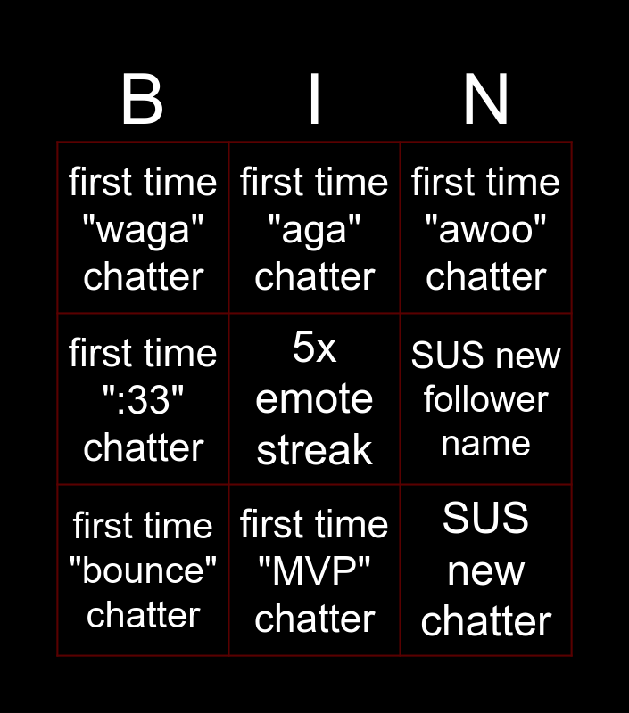 This bingo card has a free space and 8 words: SUS new follower name, first time "awoo" chatter, first time "aga" chatter, first time "bounce" chatter, first time "waga" chatter, SUS new chatter, first time ":33" chatter and first time "MVP" chatter.