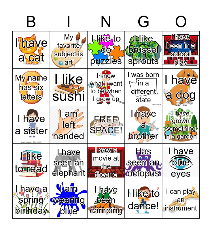 This bingo card has 24 images, a free space and 24 words: I have a spring birthday, I have seen an elephant, I know what I want to be when I grow up, I like to dance!, I have been in a school play, I have a cat, My favorite subject is art, I like to do puzzles, I have a brother, I have grown something in a garden, I have a sister, I like sushi, Has seen an octopus, I have blue eyes, My name has six letters, I am wearing blue, I have been camping, I like brussel sprouts, I have a dog, I like to read, I am left handed, I saw a movie at the theatre, I was born in a different state and I can play an instrument.