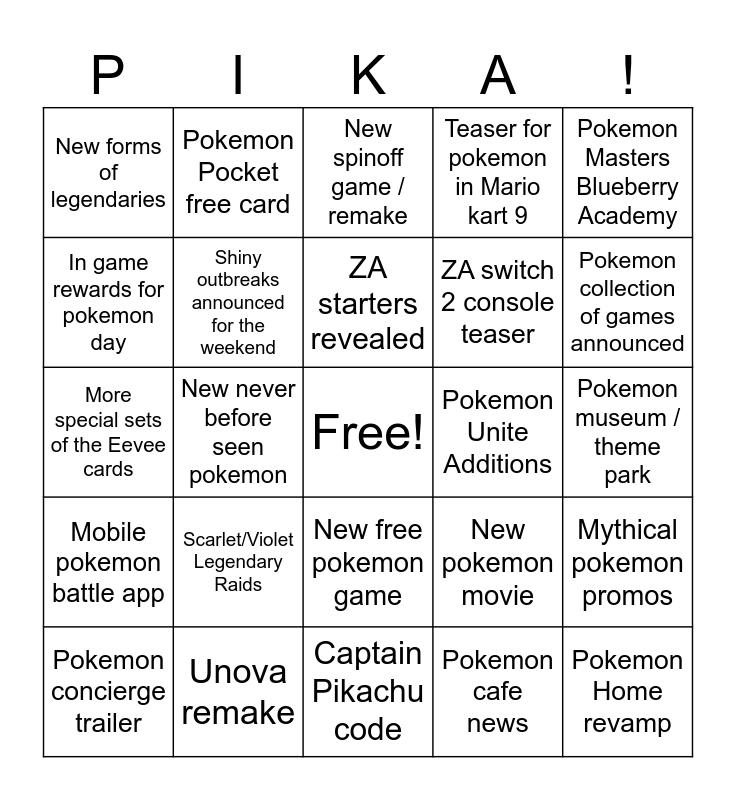 This bingo card has a free space and 24 words: Scarlet/Violet Legendary Raids, Unova remake, ZA starters revealed, Pokemon concierge trailer, Pokemon Masters Blueberry Academy, New forms of legendaries, In game rewards for pokemon day, Pokemon Pocket free card, Pokemon Unite Additions, New free pokemon game, ZA switch 2 console teaser, More special sets of the Eevee cards, New pokemon movie, Mythical pokemon promos, Shiny outbreaks announced for the weekend, Pokemon cafe news, Pokemon museum / theme park, New spinoff game / remake, Pokemon collection of games announced, New never before seen pokemon, Pokemon Home revamp, Mobile pokemon battle app, Teaser for pokemon in Mario kart 9 and Captain Pikachu code.