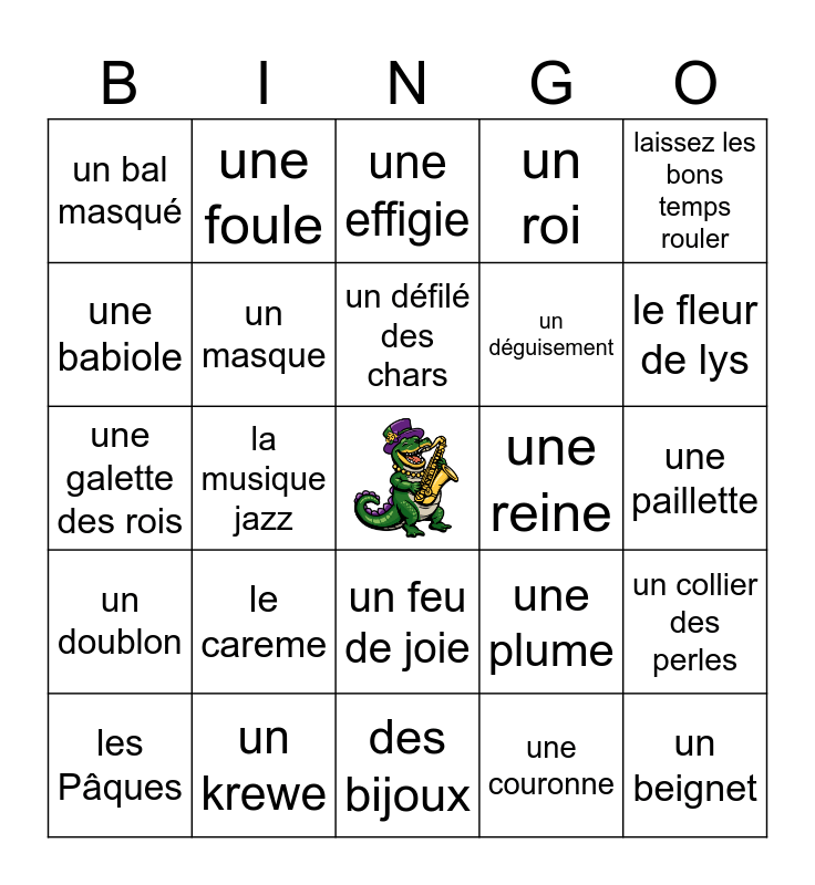 This bingo card has a free space and 24 words: le careme, un krewe, un défilé des chars, les Pâques, laissez les bons temps rouler, un bal masqué, une babiole, une foule, une reine, un feu de joie, un déguisement, une galette des rois, une plume, un collier des perles, un masque, une couronne, une paillette, une effigie, le fleur de lys, la musique jazz, un beignet, un doublon, un roi and des bijoux.