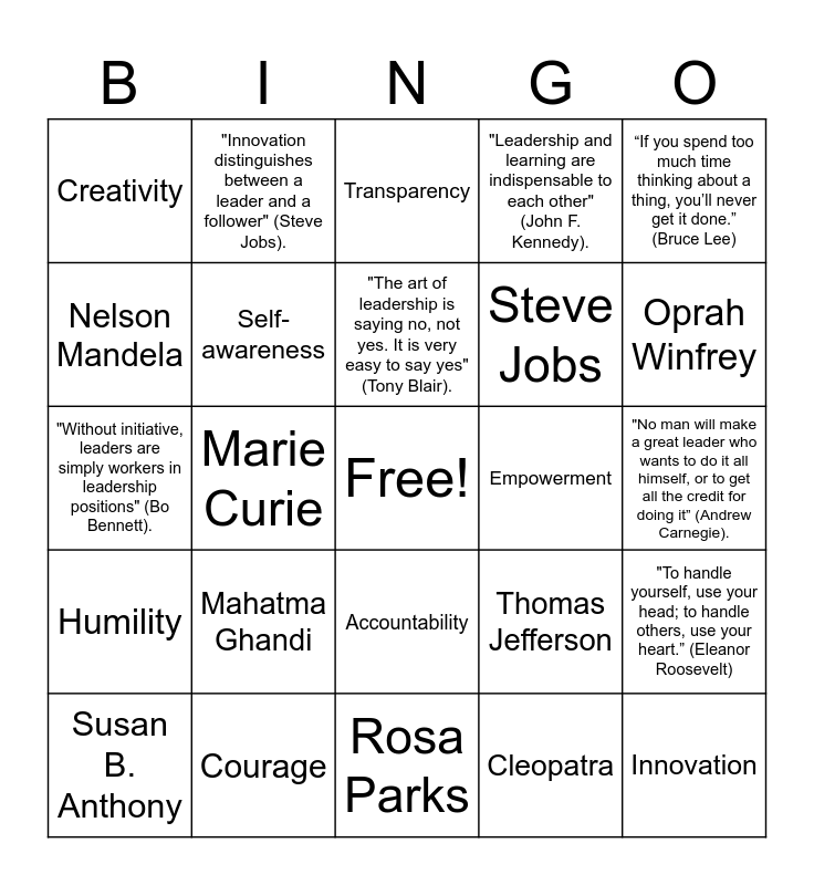 This bingo card has a free space and 24 words: Mahatma Ghandi, Courage, "The art of leadership is saying no, not yes. It is very easy to say yes" (Tony Blair)., Susan B. Anthony, “If you spend too much time thinking about a thing, you’ll never get it done.” (Bruce Lee), Creativity, Nelson Mandela, "Innovation distinguishes between a leader and a follower" (Steve Jobs)., Empowerment, Accountability, Steve Jobs, "Without initiative, leaders are simply workers in leadership positions" (Bo Bennett)., Thomas Jefferson, "To handle yourself, use your head; to handle others, use your heart.” (Eleanor Roosevelt), Self-awareness, Cleopatra, "No man will make a great leader who wants to do it all himself, or to get all the credit for doing it” (Andrew Carnegie)., Transparency, Oprah Winfrey, Marie Curie, Innovation, Humility, "Leadership and learning are indispensable to each other" (John F. Kennedy). and Rosa Parks.