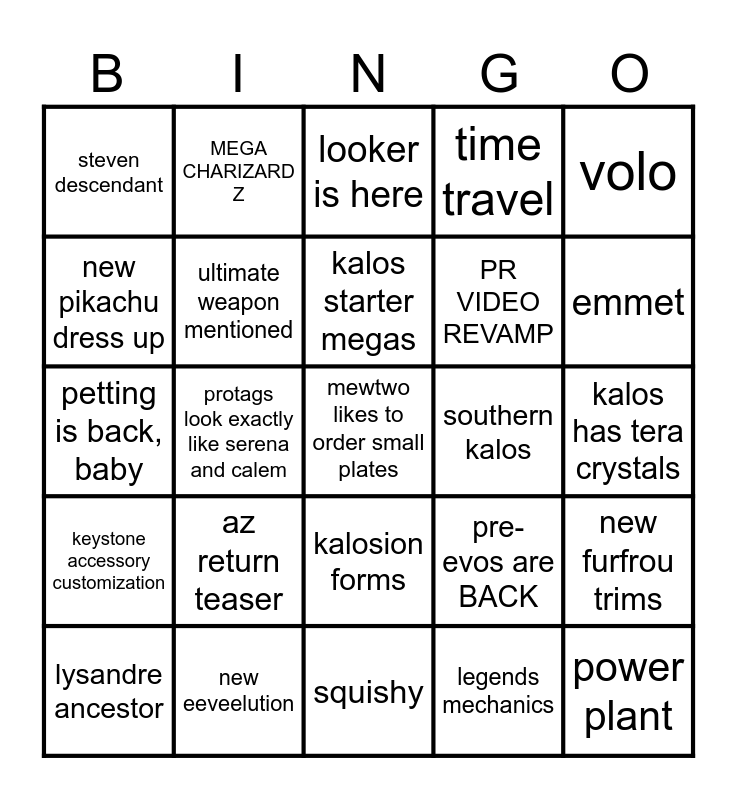 This bingo card has a free space and 24 words: az return teaser, new eeveelution, kalos starter megas, lysandre ancestor, volo, steven descendant, new pikachu dress up, MEGA CHARIZARD Z, southern kalos, kalosion forms, PR VIDEO REVAMP, petting is back, baby, pre-evos are BACK, new furfrou trims, ultimate weapon mentioned, legends mechanics, kalos has tera crystals, looker is here, emmet, protags look exactly like serena and calem, power plant, keystone accessory customization, time travel and squishy.