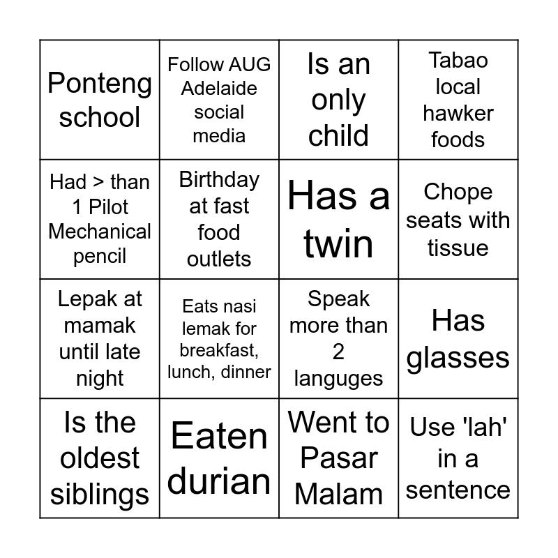 This bingo card has 16 words: Eaten durian, Has glasses, Is an only child, Ponteng school, Lepak at mamak until late night, Follow AUG Adelaide social media, Speak more than 2 languges, Went to Pasar Malam, Had > than 1 Pilot Mechanical pencil, Birthday at fast food outlets, Is the oldest siblings, Tabao local hawker foods, Eats nasi lemak for breakfast, lunch, dinner, Chope seats with tissue, Has a twin and Use 'lah' in a sentence.