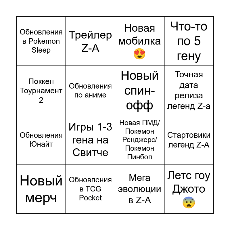 This bingo card has 16 words: Обновления в TCG Pocket, Стартовики легенд Z-A, Новая мобилка😍, Обновления в Pokemon Sleep, Обновления Юнайт, Трейлер Z-A, Новая ПМД/Покемон Ренджерс/Покемон Пинбол, Мега эволюции в Z-A, Поккен Тоурнамент 2, Обновления по аниме, Новый мерч, Что-то по 5 гену, Игры 1-3 гена на Свитче, Точная дата релиза легенд Z-a, Новый спин-офф and Летс гоу Джото😨.