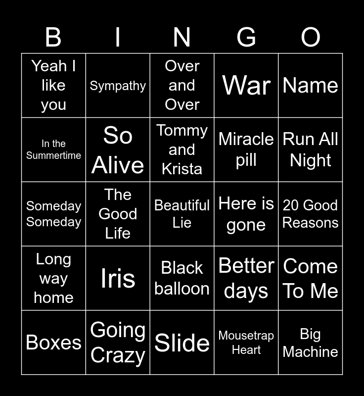This bingo card has 25 words: Iris, Slide, Tommy and Krista, Boxes, Name, Yeah I like you, In the Summertime, Sympathy, Here is gone, Black balloon, Miracle pill, Someday Someday, Better days, Come To Me, So Alive, Big Machine, 20 Good Reasons, Over and Over, Run All Night, The Good Life, Beautiful Lie, Going Crazy, Long way home, War and Mousetrap Heart.