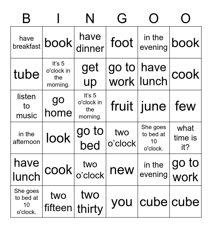 ⚠ This card has duplicate items: at night (2), book (2), cook (2), cube (2), few (2), flute (2), foot (2), fruit (2), get up (2), go home (2), go to bed (2), go to school (2), go to work (2), have breakfast (2), have dinner (2), have lunch (2), in the afternoon (2), in the evening (2), in the morning (2), It’s 5 o'clock in the morning. (2), listen to music (2), look (2), new (2), She goes to bed at 10 o'clock. (2), soup (2), They have dinner at 7:30. (2), tube (2), two fifteen (2), two forty-five (2), two o’clock (2), two thirty (2), What time do they have dinner? (2), What time does she go to bed? (2), you (2)