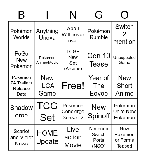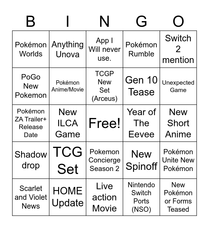This bingo card has a free space and 24 words: TCG Set, HOME Update, TCGP New Set (Arceus), Scarlet and Violet News, Switch 2 mention, Pokémon Worlds, PoGo New Pokemon, Anything Unova, Year of The Eevee, Pokemon Concierge Season 2, Gen 10 Tease, Pokémon ZA Trailer+ Release Date, New Spinoff, Pokémon Unite New Pokémon, Pokémon Anime/Movie, Nintendo Switch Ports (NSO), New Short Anime, App I Will never use., Unexpected Game, New ILCA Game, New Pokémon or Forms Teased, Shadow drop, Pokémon Rumble and Live action Movie.