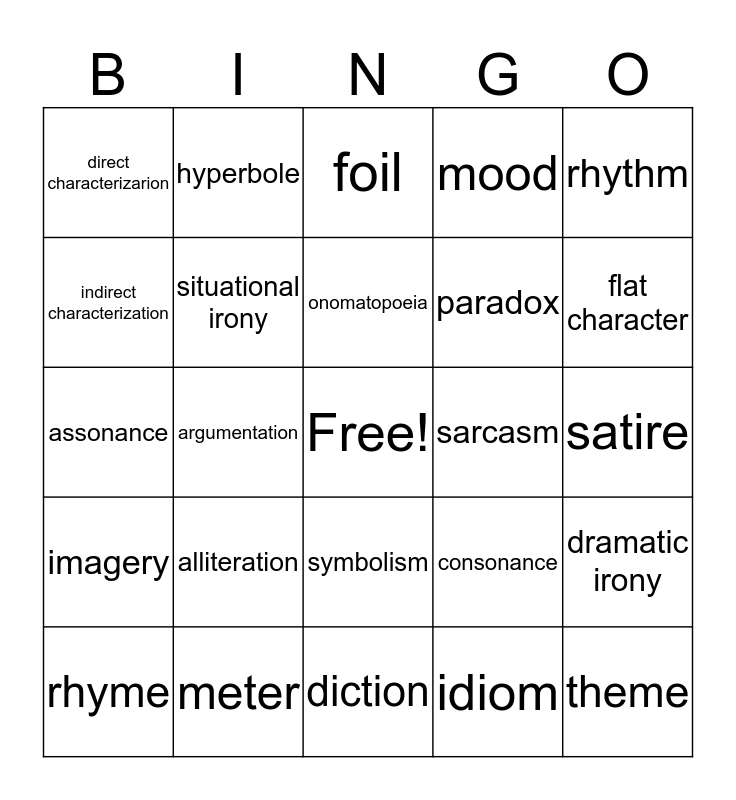 This bingo card has a free space and 24 words: alliteration, meter, onomatopoeia, rhyme, rhythm, direct characterizarion, indirect characterization, hyperbole, sarcasm, symbolism, paradox, assonance, consonance, dramatic irony, situational irony, idiom, satire, foil, flat character, argumentation, theme, imagery, mood and diction.