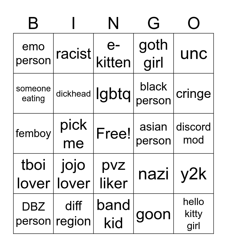 This bingo card has a free space and 24 words: jojo lover, diff region, lgbtq, DBZ person, unc, emo person, someone eating, racist, asian person, pvz liker, black person, femboy, nazi, y2k, dickhead, goon, discord mod, e-kitten, cringe, pick me, hello kitty girl, tboi lover, goth girl and band kid.
