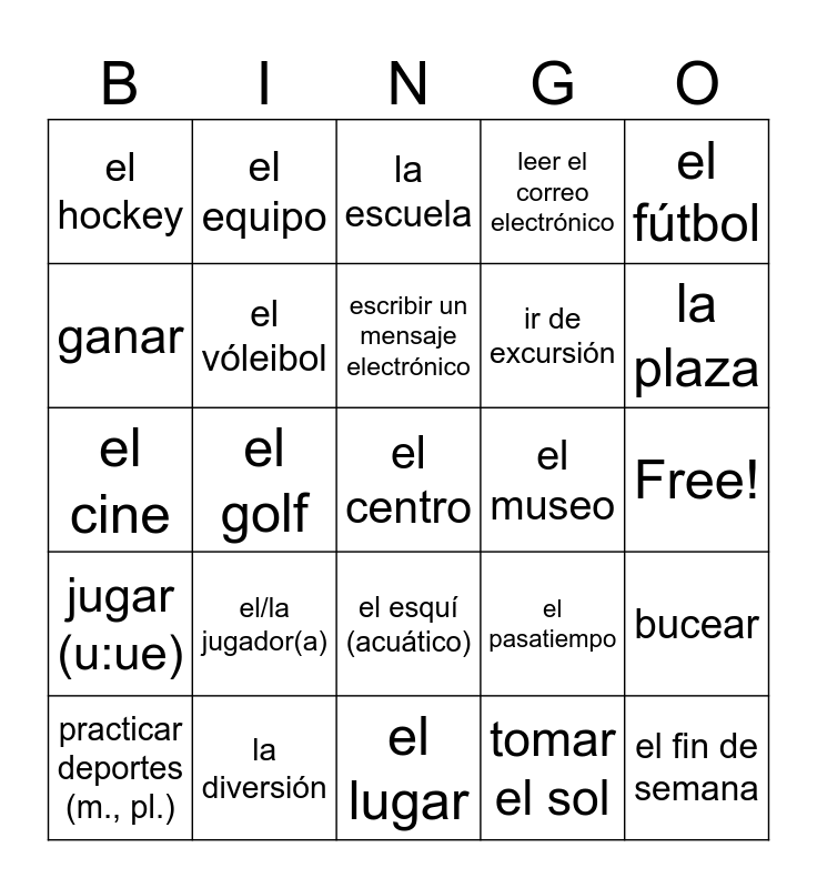 This bingo card has 64 words: andar en patineta, el baloncesto, el béisbol, bucear, el ciclismo, deportivo/a, el equipo, escalar montañas (f., pl.), escribir un mensaje electrónico, escribir una carta, el esquí (acuático), esquiar, Free!, el fútbol, el fútbol americano, ganar, el golf, el hockey, ir, ir de excursión, el/la jugador(a), jugar (u:ue), leer el correo electrónico, leer un periódico, leer una revista, nadar, la natación, el parque, el partido, pasear, pasear en bicicleta, patinar (en línea), la pelota, la piscina, la plaza, practicar deportes (m., pl.), el tenis, tomar el sol, visitar monumentos (m., pl.), el vóleibol, el cine, el museo, el gimnasio, el restaurante, el café, el centro, la diversión, el fin de semana, el pasatiempo, los ratos libres, el videojuego, la iglesia, el lugar, ver películas, favorito, favorita, la ciudad, la escuela, la biblioteca, la cafetería, la casa, el estadio, el laboratorio, la librería and la universidad.