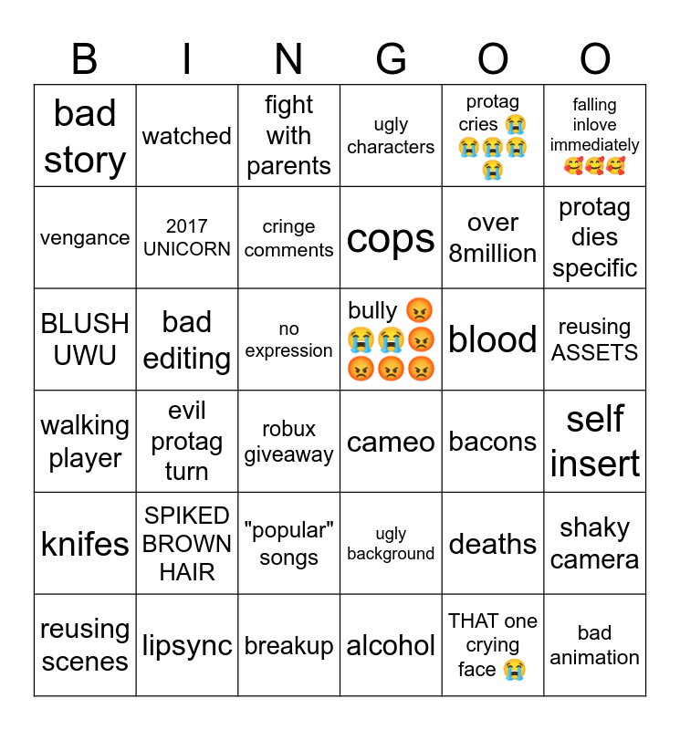 This bingo card has 36 words: ugly background, "popular" songs, alcohol, vengance, walking player, bully π‘πππ‘π‘π‘π‘, 2017 UNICORN, breakup, protag cries πππππ, deaths, protag dies specific, ugly characters, shaky camera, bad editing, cops, bad story, knifes, blood, BLUSH UWU, fight with parents, no expression, evil protag turn, cameo, robux giveaway, bacons, watched, over 8million, lipsync, cringe comments, falling inlove immediately π₯°π₯°π₯°, bad animation, reusing scenes, self insert, reusing ASSETS, SPIKED BROWN HAIR and THAT one crying face π.