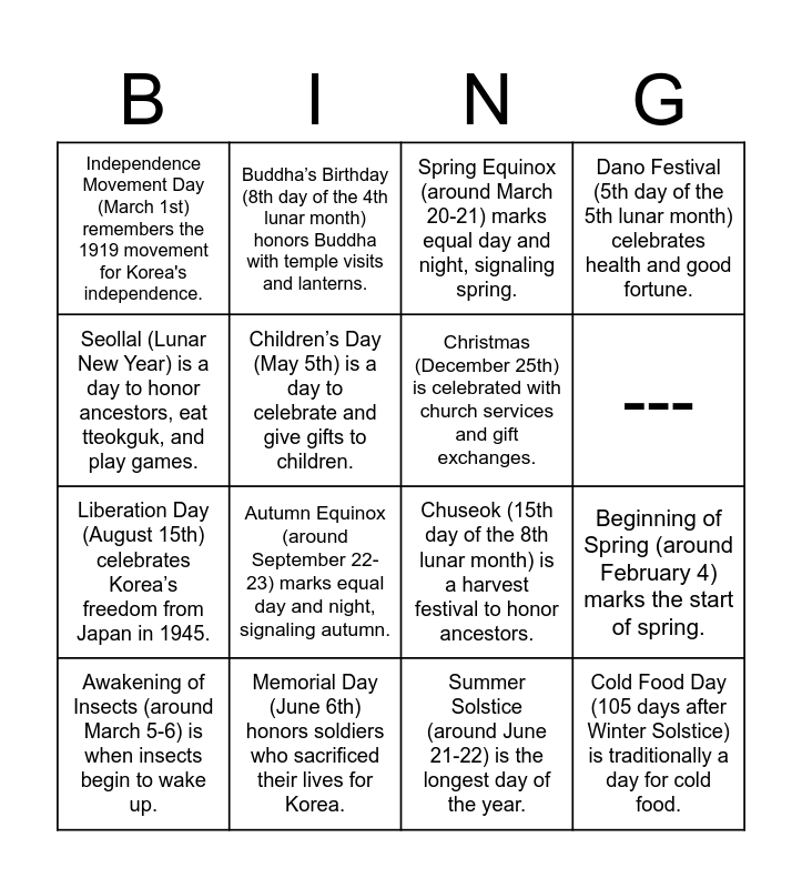 This bingo card has 24 words: !, Here are the sentences with the Korean holidays, as requested:, ---, New Year's Day (January 1st) is a day to celebrate the new year with family and resolutions., Seollal (Lunar New Year) is a day to honor ancestors, eat tteokguk, and play games., Independence Movement Day (March 1st) remembers the 1919 movement for Korea's independence., Children’s Day (May 5th) is a day to celebrate and give gifts to children., Buddha’s Birthday (8th day of the 4th lunar month) honors Buddha with temple visits and lanterns., Memorial Day (June 6th) honors soldiers who sacrificed their lives for Korea., Constitution Day (July 17th) celebrates Korea’s first constitution from 1948., Liberation Day (August 15th) celebrates Korea’s freedom from Japan in 1945., Chuseok (15th day of the 8th lunar month) is a harvest festival to honor ancestors., National Foundation Day (October 3rd) celebrates the founding of Gojoseon by Dangun., Hangul Day (October 9th) honors the creation of the Korean alphabet by King Sejong., Christmas (December 25th) is celebrated with church services and gift exchanges., Winter Solstice (around December 21-22) is the shortest day of the year, with red bean porridge., Summer Solstice (around June 21-22) is the longest day of the year., Spring Equinox (around March 20-21) marks equal day and night, signaling spring., Autumn Equinox (around September 22-23) marks equal day and night, signaling autumn., Beginning of Spring (around February 4) marks the start of spring., Awakening of Insects (around March 5-6) is when insects begin to wake up., Cold Food Day (105 days after Winter Solstice) is traditionally a day for cold food., Dano Festival (5th day of the 5th lunar month) celebrates health and good fortune. and Sambok (three hottest days of summer) is a time to eat ginseng chicken soup..
