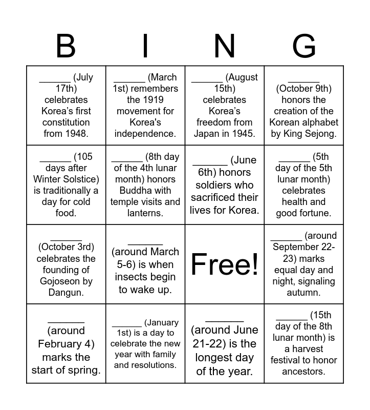 This bingo card has 22 words: ______ (January 1st) is a day to celebrate the new year with family and resolutions., ______ (Lunar New Year) is a day to honor ancestors, eat tteokguk, and play games., ______ (March 1st) remembers the 1919 movement for Korea's independence., ______ (May 5th) is a day to celebrate and give gifts to children., ______ (8th day of the 4th lunar month) honors Buddha with temple visits and lanterns., ______ (June 6th) honors soldiers who sacrificed their lives for Korea., ______ (July 17th) celebrates Korea’s first constitution from 1948., ______ (August 15th) celebrates Korea’s freedom from Japan in 1945., Free!, ______ (15th day of the 8th lunar month) is a harvest festival to honor ancestors., ______ (October 3rd) celebrates the founding of Gojoseon by Dangun., ______ (October 9th) honors the creation of the Korean alphabet by King Sejong., ______ (December 25th) is celebrated with church services and gift exchanges., ______ (around December 21-22) is the shortest day of the year, with red bean porridge., ______ (around June 21-22) is the longest day of the year., ______ (around March 20-21) marks equal day and night, signaling spring., ______ (around September 22-23) marks equal day and night, signaling autumn., ______ (around February 4) marks the start of spring., ______ (around March 5-6) is when insects begin to wake up., ______ (105 days after Winter Solstice) is traditionally a day for cold food., ______ (5th day of the 5th lunar month) celebrates health and good fortune. and ______ (three hottest days of summer) is a time to eat ginseng chicken soup..