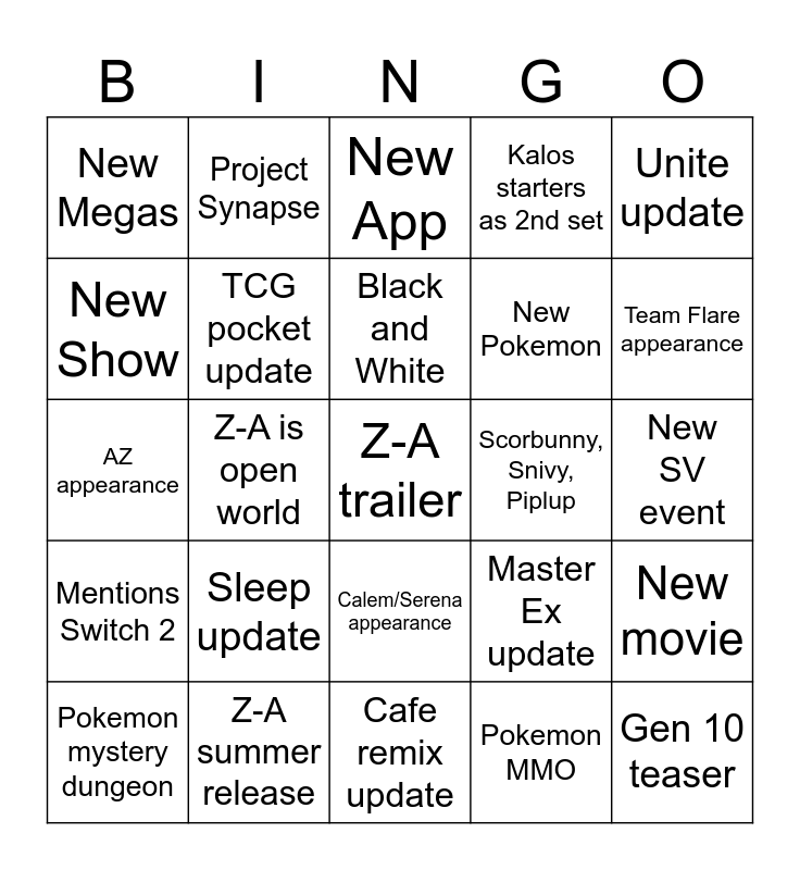 This bingo card has a free space and 24 words: Sleep update, Z-A summer release, Black and White, Pokemon mystery dungeon, Unite update, New Megas, New Show, Project Synapse, Scorbunny, Snivy, Piplup, Calem/Serena appearance, New Pokemon, AZ appearance, Master Ex update, New movie, TCG pocket update, Pokemon MMO, New SV event, New App, Team Flare appearance, Z-A is open world, Gen 10 teaser, Mentions Switch 2, Kalos starters as 2nd set and Cafe remix update.